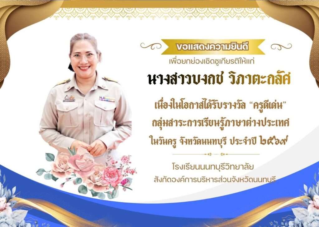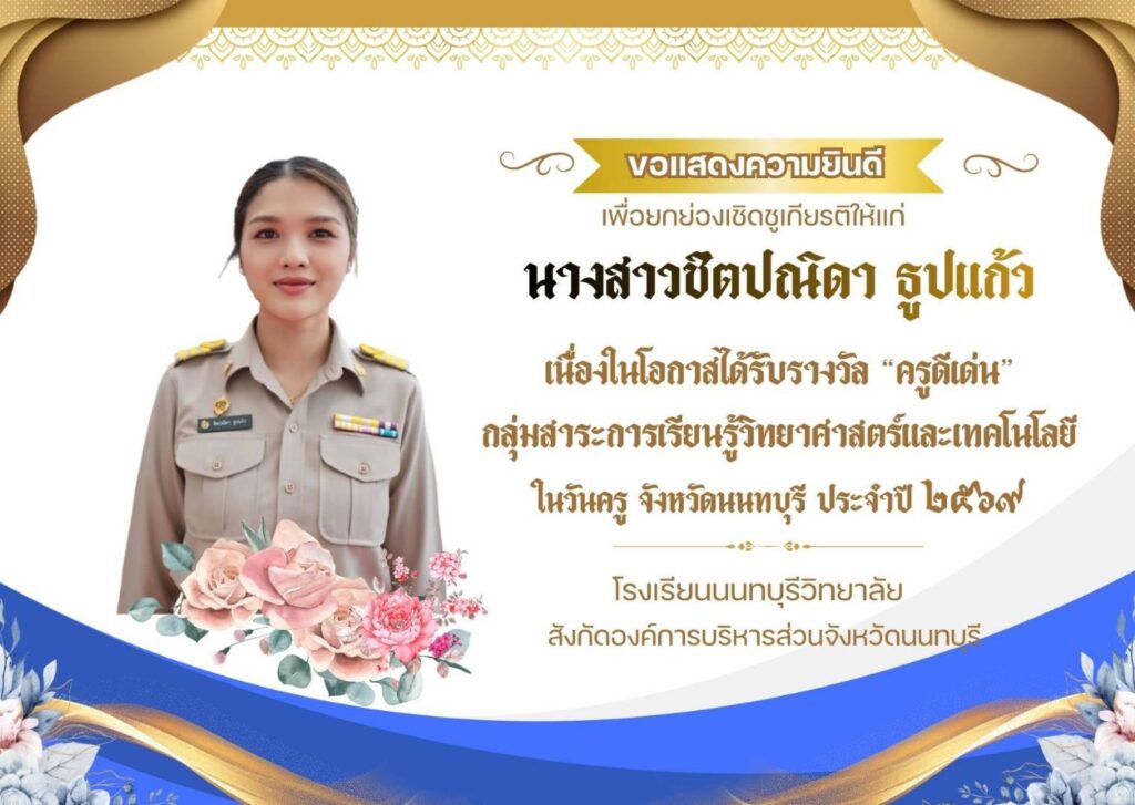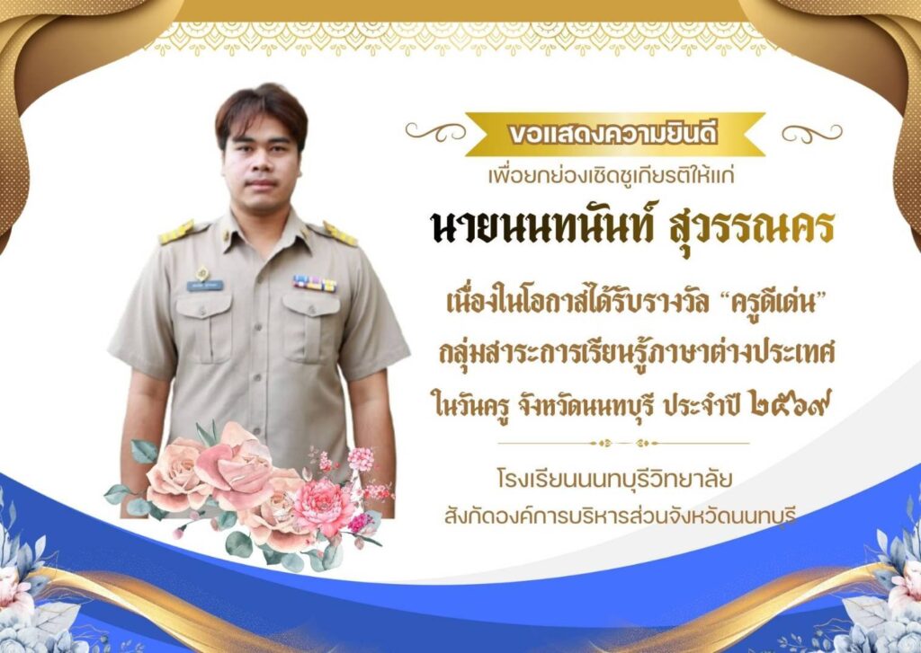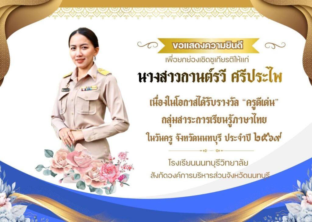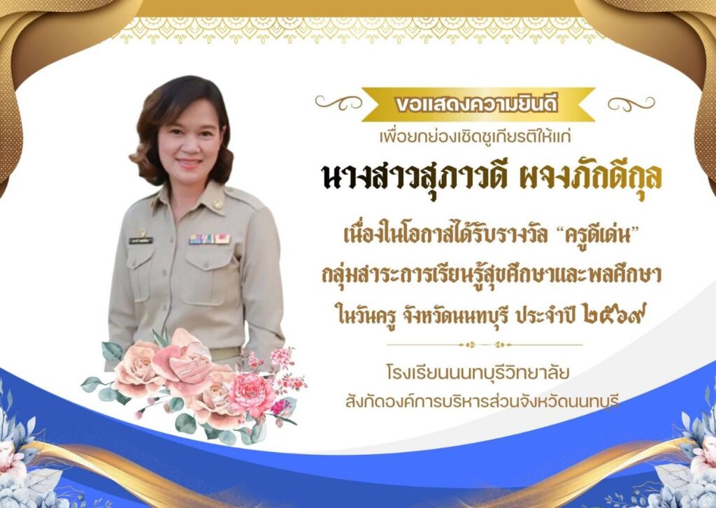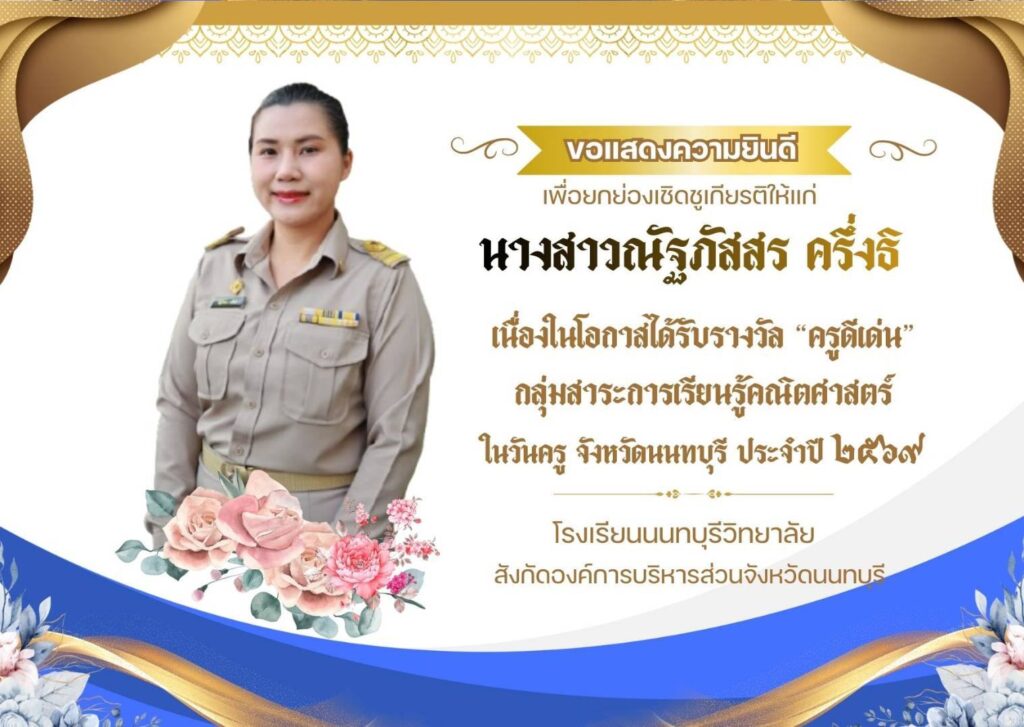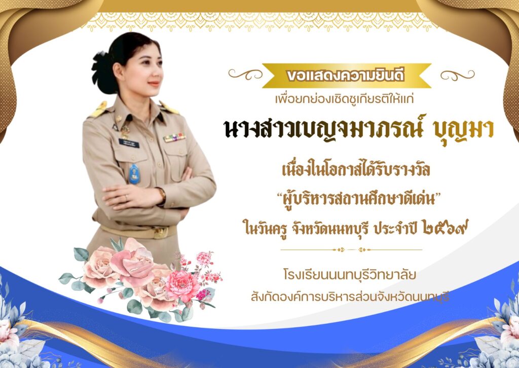 ในโอกาสที่ได้รับการคัดเลือกให้เข้ารับรางวัล “ผู้บริหารสถานศึกษาดีเด่นและครูดีเด่น” เนื่องในวันครู จังหวัดนนทบุรี